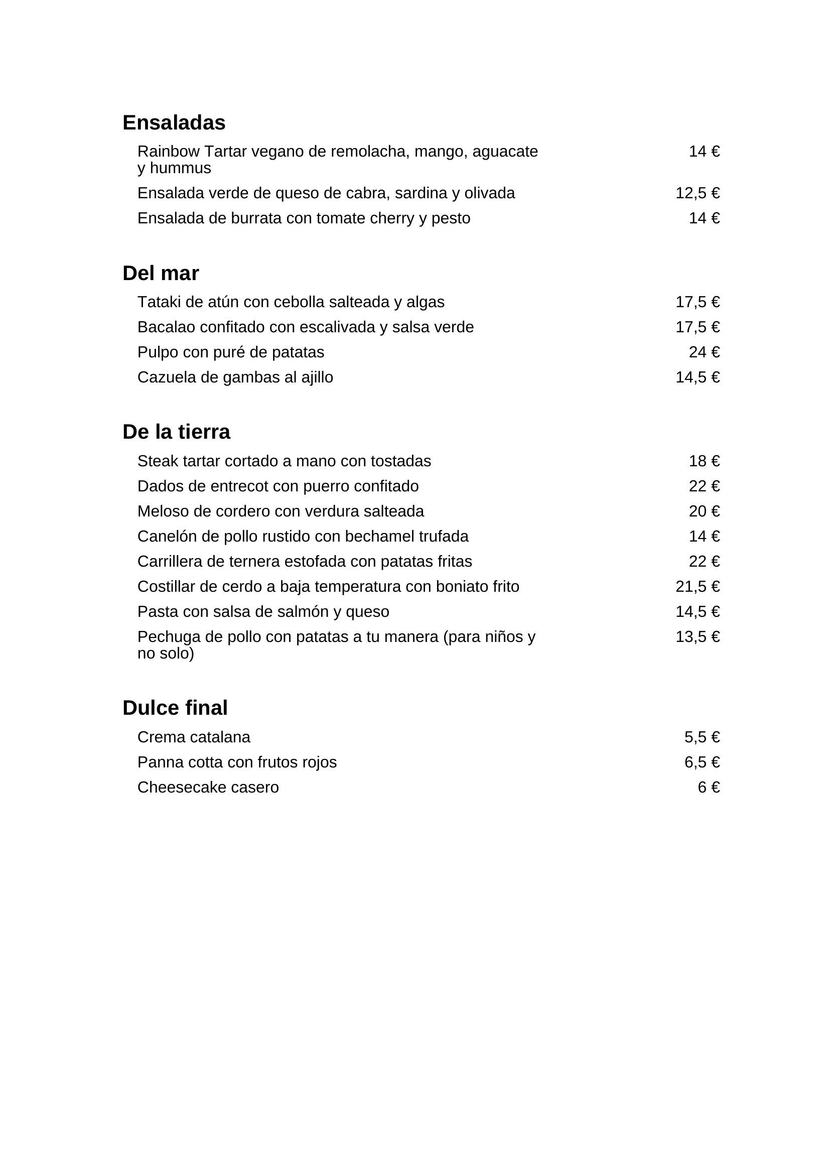 Last night I had a spectacular dinner with my husband. To start, I enjoyed an exquisite hand-cut Steak Tartar accompanied by cheese toasties, while he opted for an omelet with cod, a delight! For the second, we decided to share and try the Low Angus Loin with potato cake and an incredible bleu d'Auvergne cream, cooked to perfection. To finish, the desserts were the jewel of the night: a soft and delicious Cheesecake and a Torrija that, without a doubt, is the best I have ever tasted. An unforgettable culinary experience. We will definitely return!
